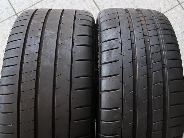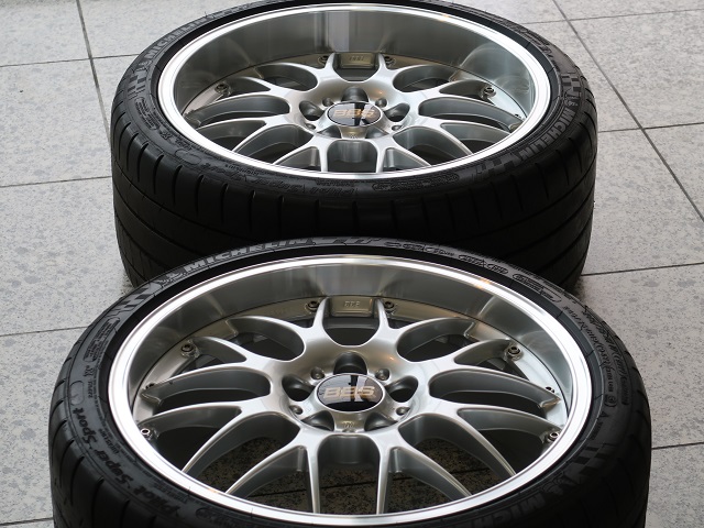 もはや誰も知ってる、永遠の憧れのメッシュのアルミホイール、ドイツのBBSのアルミホイールと、ミシュランのタイヤのUSEDセットとなります。19インチサイズのBBSのRS−GTで、2ピース&深リムが印象的なホイールです。近年の車は深いリムが履けないオフセットが多いですが、パキッと出たリムが迫力です!タイヤはこれまたBMW乗りの憧れと言えるミシュランで、パイロット・スーパースポーツとなります。ホイール&タイヤサイズは、フロントホイールは8 1/2J×19でET33、リアホイールは9 1/2J×19でET25となります。正式な品番は、フロントがRS985Aで、リアがRS947Aとなりますので、ご参考にしてください。タイヤサイズはフロントが245/35ZR19で、275/30ZR19で、フロントは約7ミリ、リアは約6ミリの残り溝となります。新品の溝は約8ミリですから、十分に残っていますね。フロントにスペーサーを使用すれば、E39やE60などにピッタリの状態となります。価格はお電話かメールにてお問い合わせください(メールの場合、返信が遅れる場合がございますので、お急ぎの方はお電話でお願いします。)