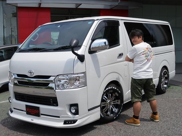 背中で漢を語る私としてはモデリスタのエアロとさりげないローダウン&グッドイヤーのホワイトレターで決めてみました。納車されてすぐに九州・関西方面に出張に行きましたが、やはりハイエースは仕事に使うのにピッタリ。今はプライベートの車が無いのですが、仕事も順調になってきたので、そろそろBMWに戻ろうかと思っています。