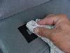 ②③汚れが目立つグレーのレザーシートで検証。黒テープで四角を作り、その中をゴシゴシやってみました。